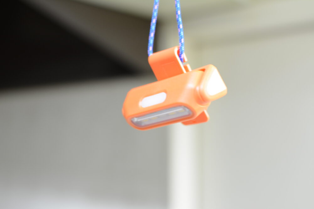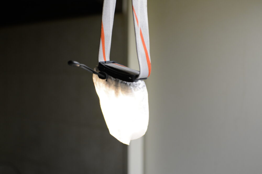 ヘッドライトに被せたらクラッシャブルランタンシェードに付属するカラビナを使用することで、テントなどに吊るして使用することができます!
